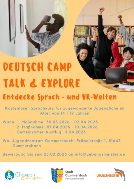 Wie schon im letzten Jahr wird es auch 2026 in den Osterferien einen kostenlosen Sprachkurs für zugewanderte Jugendliche im Alter von 14-19 Jahren geben. Nähere Informationen und Bewerbung unter info@uebungsmeister.de